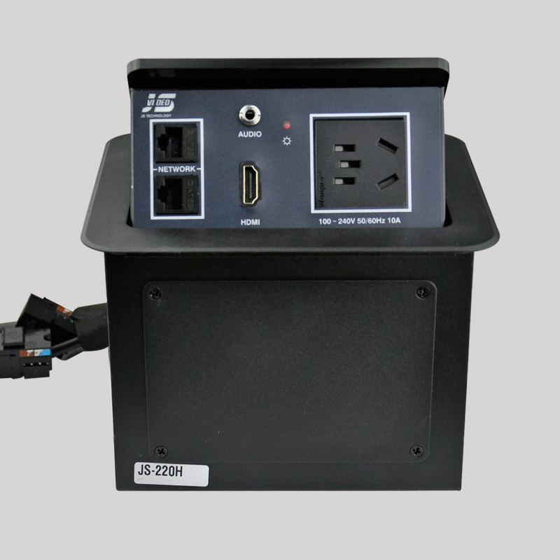 ? JS-5+系列可藏式接線盒提供了一個整潔、緊湊、簡單的鏈接解決方案。接線盒采用氣動與機械閉鎖式結構、上下接口貫穿式設計,巧妙的實現升起和閉合。使用時只需輕按接線盒頂部,釋放機械閉鎖,接線盒被氣動裝置順暢撐開,隱藏的電源、網絡、電話、視頻、音頻等各種接口即呈45°展現出來。使用完畢后,輕按接線盒頂部,機械閉鎖關閉,各種接口隱藏起來,隱藏后的接線盒與平臺保持水平。
