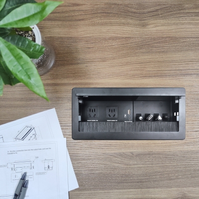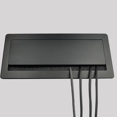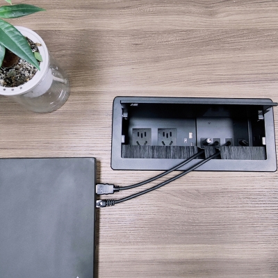 JS-Z400自收式接線盒提供了一個整潔、緊湊、簡單的連接解決方案,接線盒采用掀蓋式結構設計,使用時掀起內面板,各種線纜及接口展現出來;線纜采用自收式設計,使用時直接拉出線纜連接后即可使用,使用完畢線纜可自動收回接線盒內,實現了開會簡單入手、閉會就走,使整個會議桌面整潔、有序。